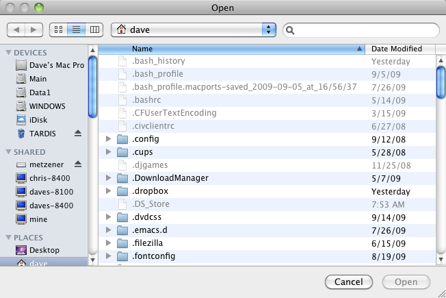 In Snow Leopard (OS X 10.6+), if you need to open a hidden file, all you need to do is type Cmd-Shift-. (that’s a period) in the standard Open File dialog. All hidden files will be displayed.