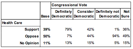 Stunning! Those that overwhelmingly oppose healthcare are also overwhelmingly unlikely to vote for a Democrat, any Democrat in the upcoming 2010 Congressional mid-terms. (PDF of polling data here)