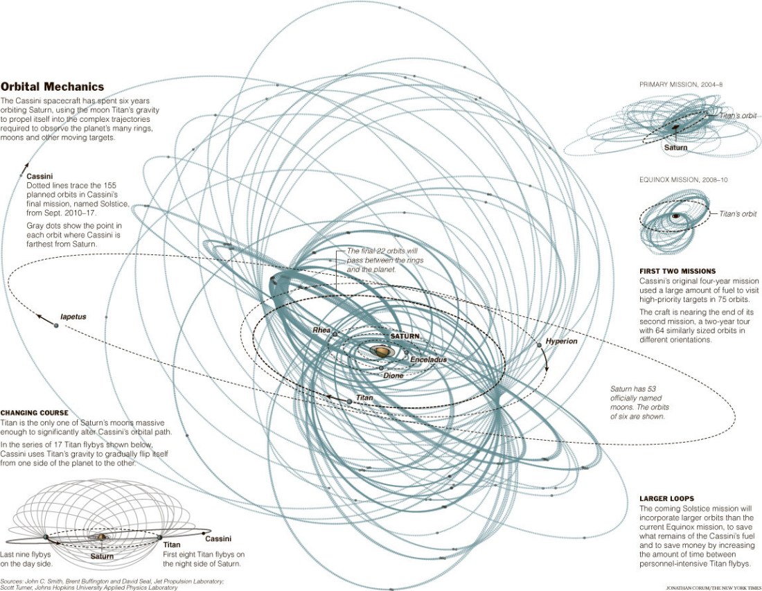 The final “reference trajectory” calculates all the course corrections and various gravity-assisted adjustments, tracking through those seven years, all the while correlating scientific goals with manpower and funding availability. Out seven years. This path “includes 56 passes over Titan, 155 orbits of Saturn in different inclinations, 12 flybys of Enceladus, 5 flybys of other large moons.” Then the probe will fly into Saturn and be destroyed.