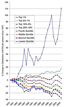 [An] increasing share of national income [has] gone to the top 1 percent of earners since the 1970s, when their share was 8 percent to 9 percent. In the 1980s, it rose to 10 percent to 14 percent. In the late-’90s, it was 15 percent to 19 percent. In 2005, it passed 21 percent. By 2007, the last year for which complete data are available, the richest 1 percent were taking more than 23 percent of all income.