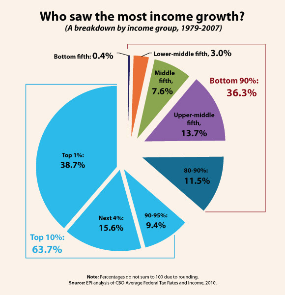 38.7% of all of the income growth accrued to the upper 1% over the 1979-2007 period: a greater share than the 36.3% share received by the entire bottom 90% of the population.